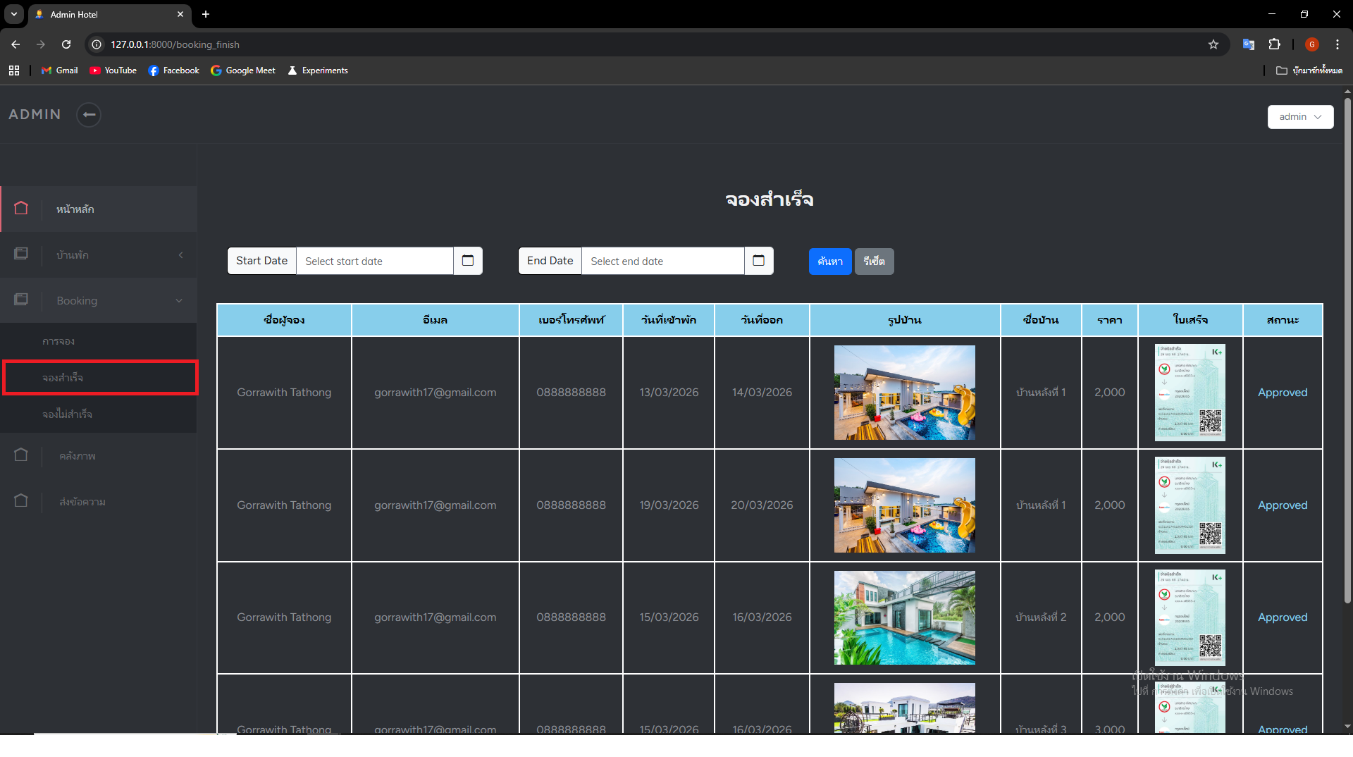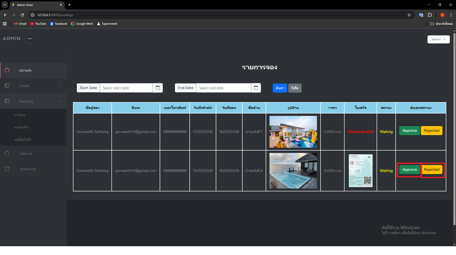 จะขึ้นข้อมูลจองบ้านพักของ User ถ้ากดปุ่ม Approve จะอนุมัติการจอง แต่ถ้ากดปุ่ม Rejected จะเป็นการปฏิเสธการจอง (กดที่รูปเพื่อดูรายละเอียด)