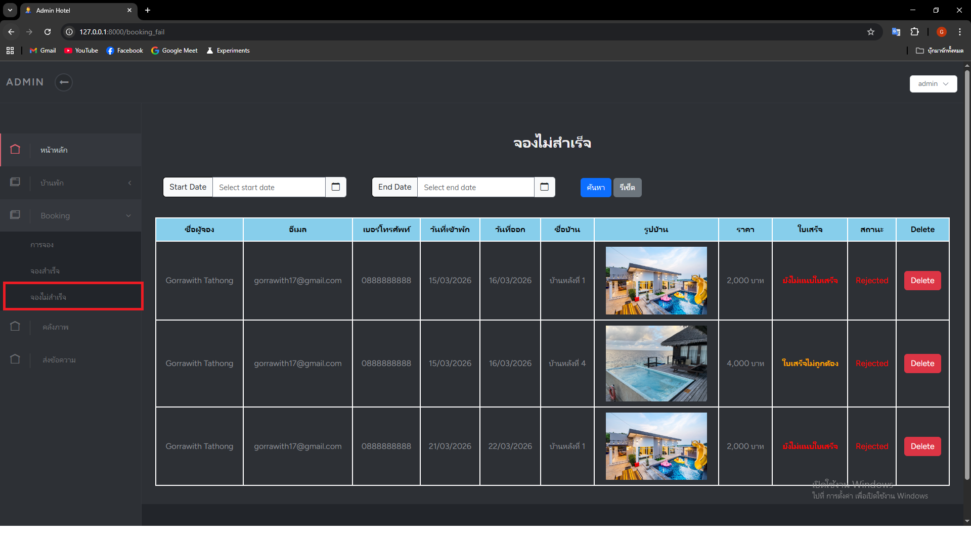 เมื่อการจองของ User ไม่สำเร็จ ข้อมูลจะมาอยู่ในหน้า จองไม่สำเร็จ และจะแจ้งสาเหตุของการจองที่ไม่สำเร็จ (กดที่รูปเพื่อดูรายละเอียด)